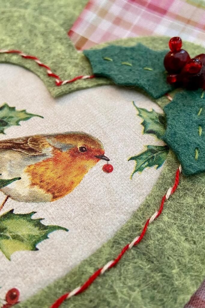 Felt Christmas hearts quickly provide a handcrafted touch, especially when you layer them with printed centers that disguise uneven cutting a little better.