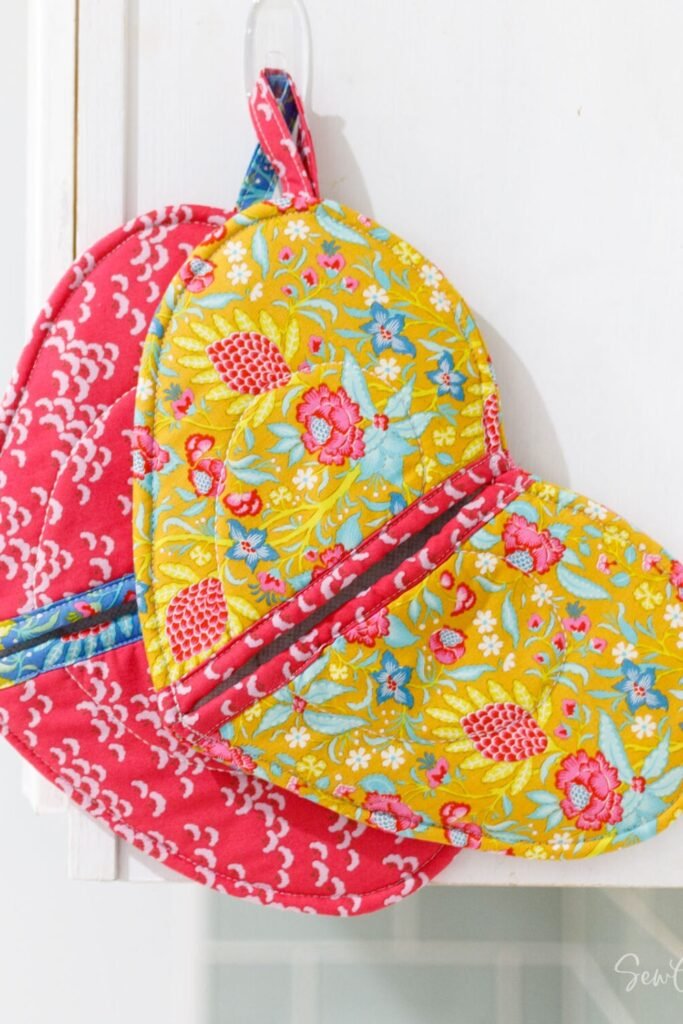 Bright fabric layers make simple heart shapes into fun kitchen guards that keep hands safe without becoming big, clumsy mittens.