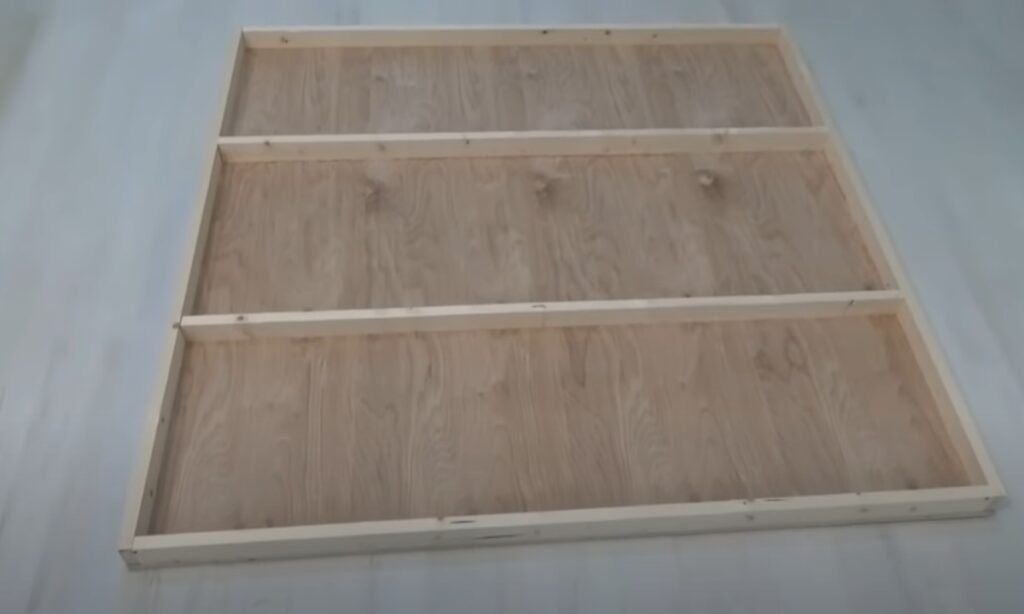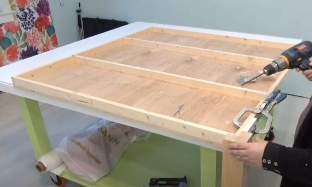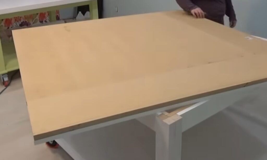 Use a 48-inch by 48-inch sheet of half-inch plywood. Build a frame on the bottom side with glue and nails to make it stronger.