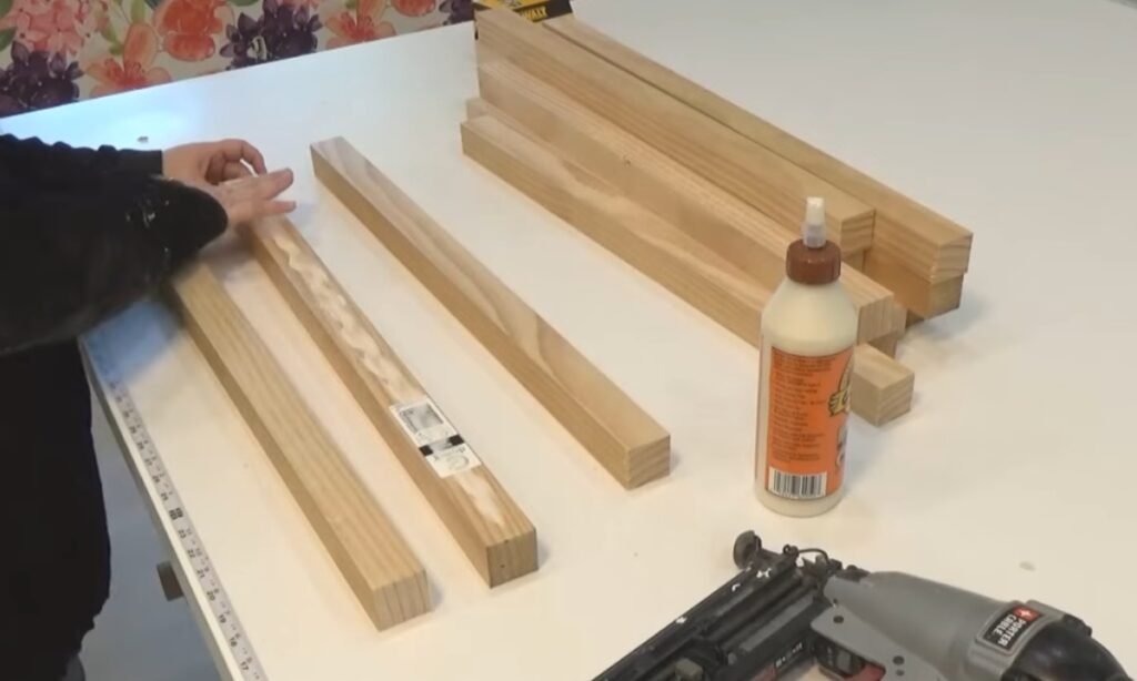 Take three pieces and glue them together, then secure with nails to create one strong leg. Repeat this process to build four sturdy legs total.