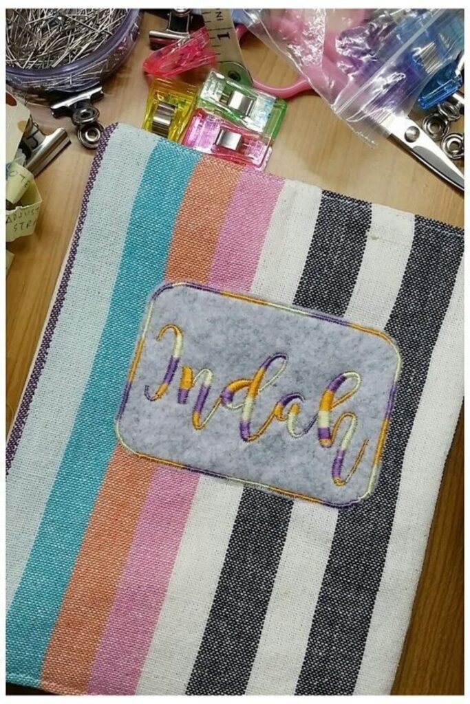 Bold name embroidery makes a standard fabric folder into a personal sewing buddy that you can always find in your home.
