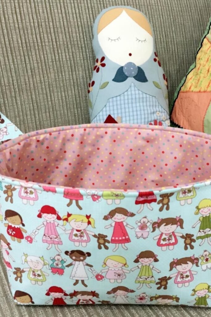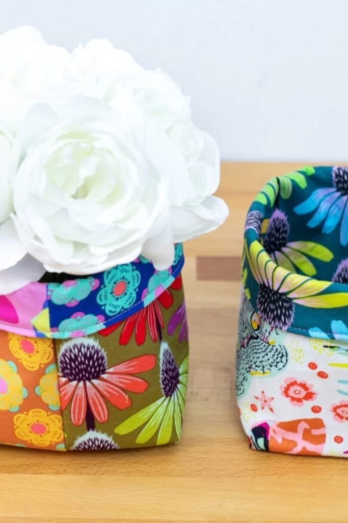 The bin keeps its shape while keeping fabric scraps, yarn balls, or small sewing equipment thanks to reinforced seams and soft interfacing.