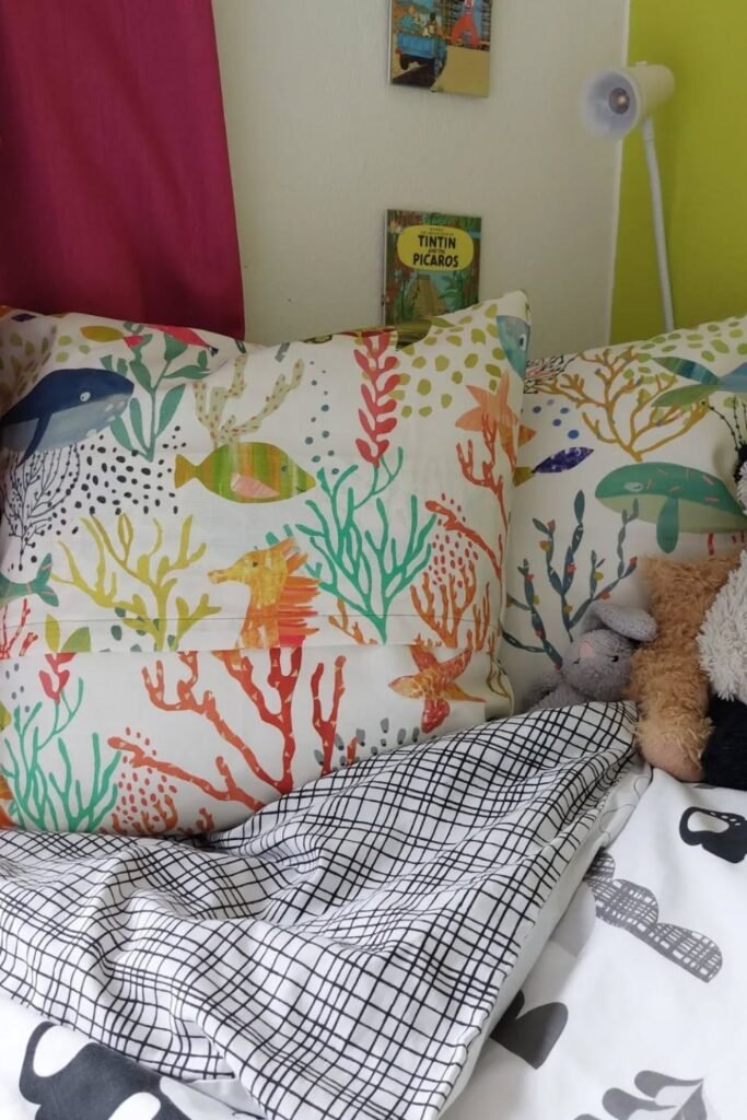 Print in bold Pillow coverings are a great way for novices to learn long, neat seams and make dull beds or reading areas look new again.