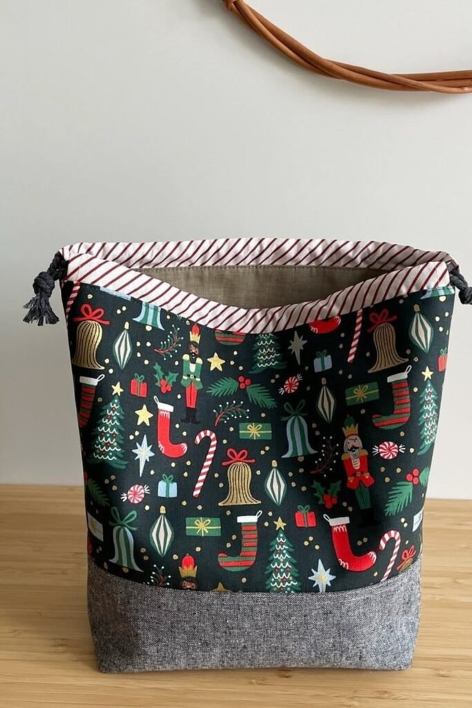 This soft drawstring bin becomes a bright storage space with holiday patterns that can be used all year round on desks and in tidy corners.
