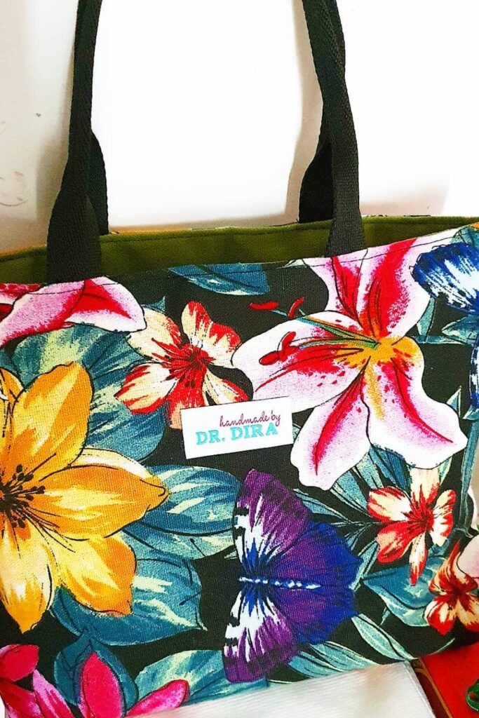 Cut firm cotton with a matching lining, lightly box the edges, then sew on reinforced straps before turning everything right-side out.