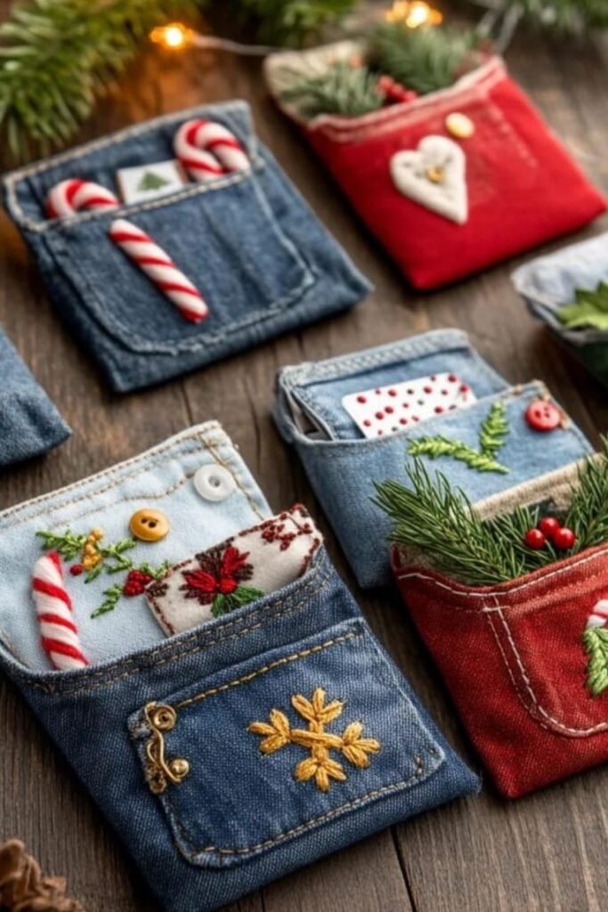Old jeans pockets make great micro holders for small gifts that quickly look better without carving out complicated forms or wasting fabric.