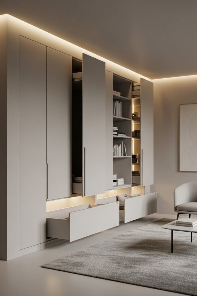 Hidden storage design focuses on building storage into walls, floors, and furniture so it disappears visually.