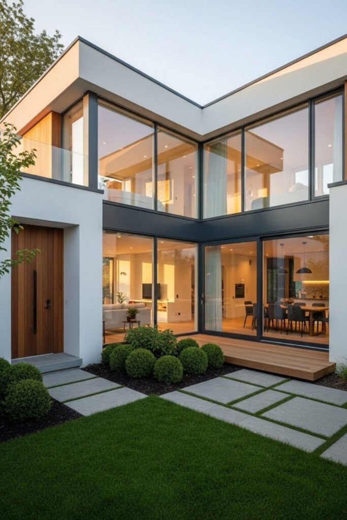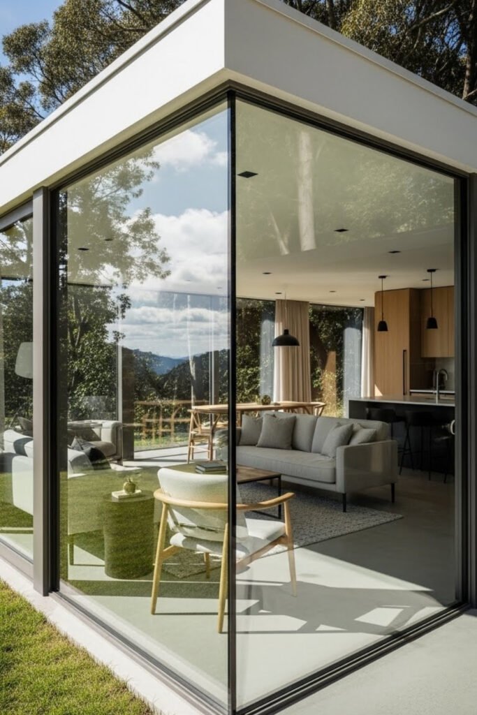 A glass corner small house replaces solid walls with floor-to-ceiling windows at the corner of the structure. This brings in maximum light and creates a wide, open view that makes the interior feel much larger.