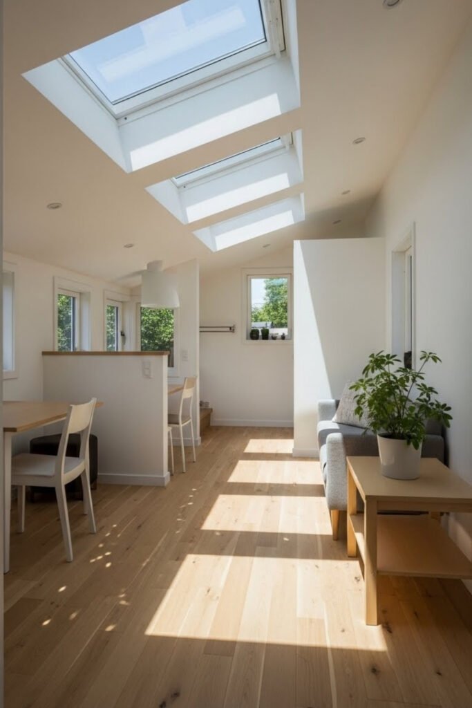A skylight-driven small house relies on roof openings to flood the interior with natural light. This reduces the need for large windows and helps maintain privacy on tight lots.