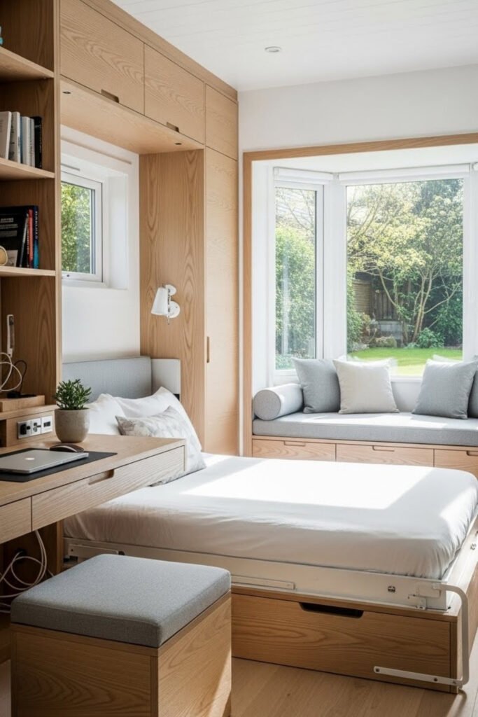 A built-in focused small house uses custom furniture like benches, beds, and desks that are integrated into the structure. This eliminates bulky standalone pieces and frees up floor space.