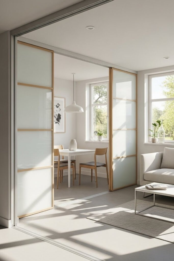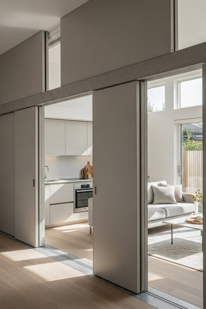 In a small house, sliding walls provide flexibility while maintaining a clean, modern look that avoids the heaviness of permanent partitions.
