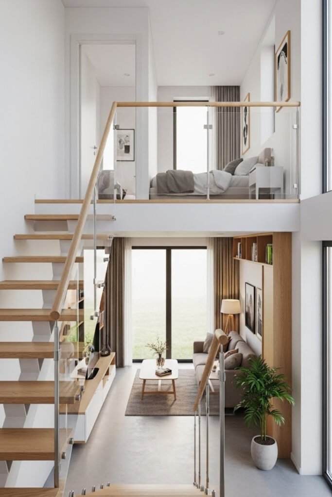 This small house idea turns the staircase into usable storage with drawers, cabinets, or shelves built directly underneath. Instead of wasting space, the stairs become a functional feature.