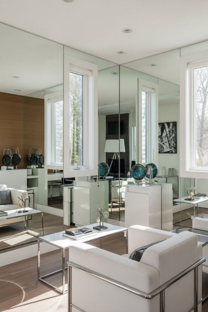 A mirror-enhanced small house uses reflective surfaces to visually double the space. Strategically placed mirrors bounce light across the room and reduce the feeling of enclosure.