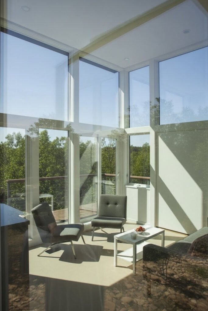 A window-wrapped small house surrounds the living area with windows on multiple sides. Natural light enters from every angle, making the space feel open and connected to its surroundings.