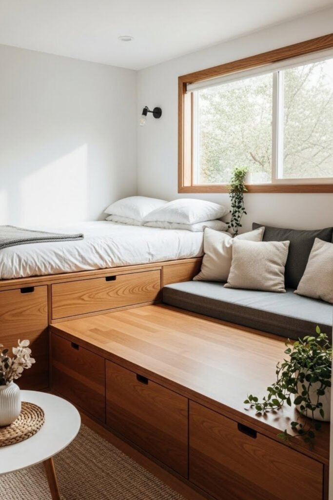 In a small house, this creates privacy without permanent separation. You can adapt the layout for work, rest, or guests while keeping the home feeling open most of the time.