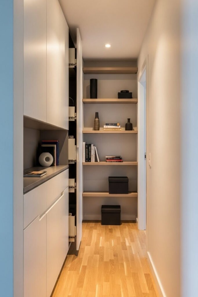 An efficient corridor small house turns hallways into usable space with storage, desks, or display shelves. Instead of wasted square footage, circulation areas become functional.