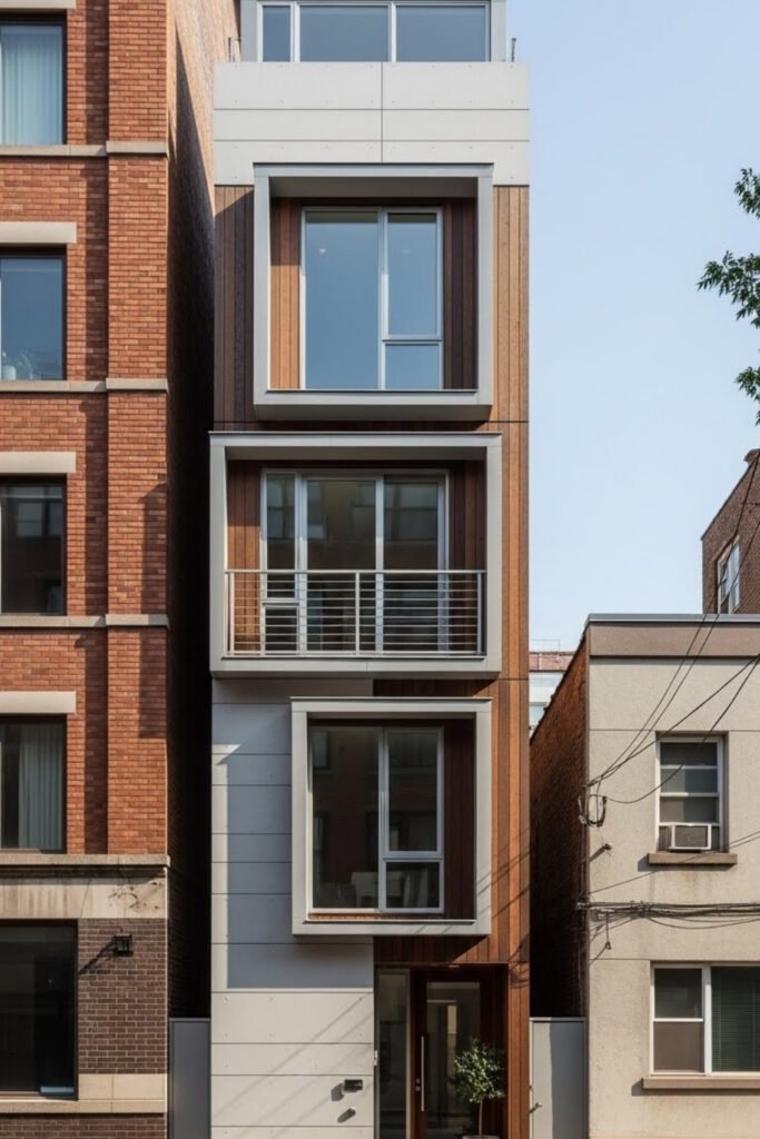 A vertical narrow house grows upward instead of outward, making it perfect for tight urban lots. Each floor serves a specific purpose—living below, sleeping above—so space feels organized, not cramped.