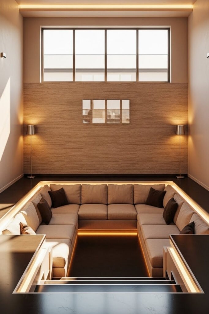 A sunken living area lowers the seating space slightly below the rest of the floor, creating separation without walls.