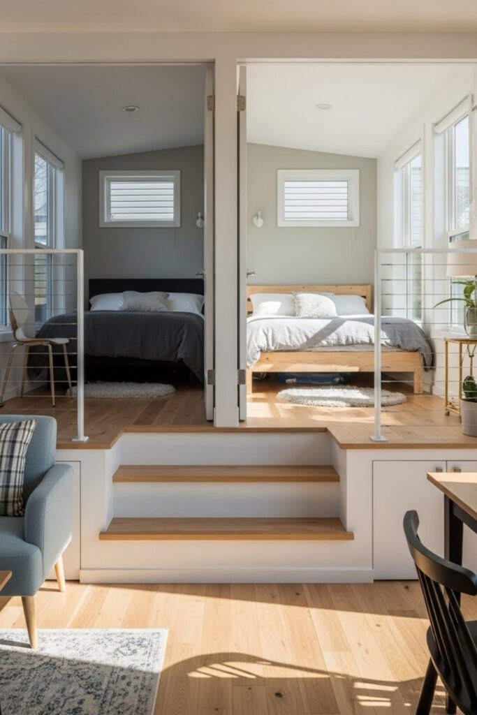 A raised platform small house slightly elevates one area, such as the bed or seating zone. The height change defines space without walls and often allows storage underneath.