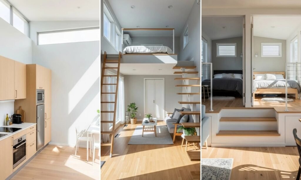 A split-level small house uses half-level changes instead of full floors to separate spaces without increasing square footage. Living, sleeping, and working zones feel distinct while staying visually connected.