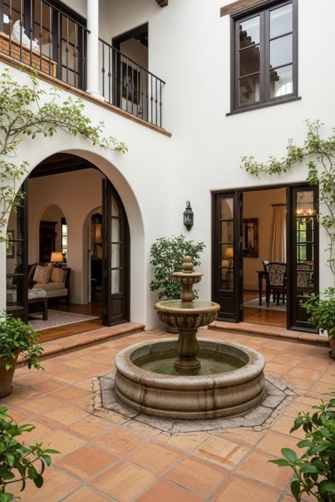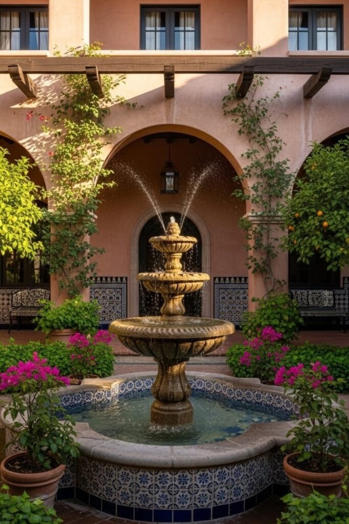 An inner fountain brings movement and sound into a Spanish-style layout. Often placed in courtyards or entry spaces, fountains help cool the air naturally.