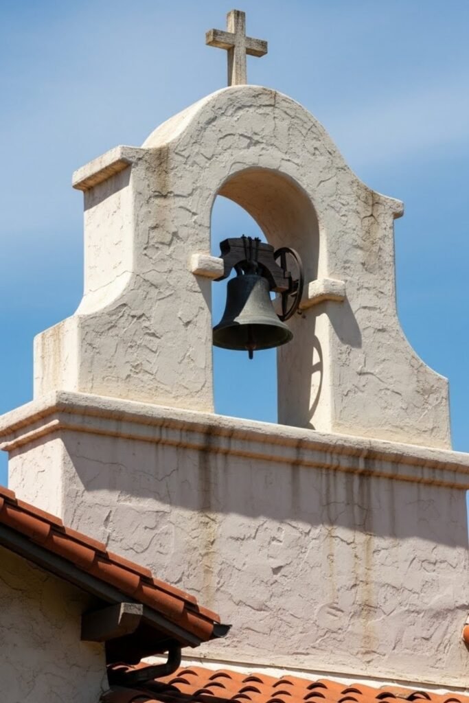 A bell gable adds a historic Spanish mission touch to the home’s exterior. This roof feature usually rises above the main structure and becomes a visual focal point.