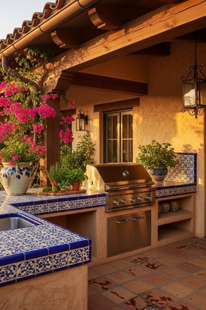 An outdoor kitchen fits naturally into Spanish-style living. Usually placed in a courtyard or patio, this space supports cooking and dining in warm weather.