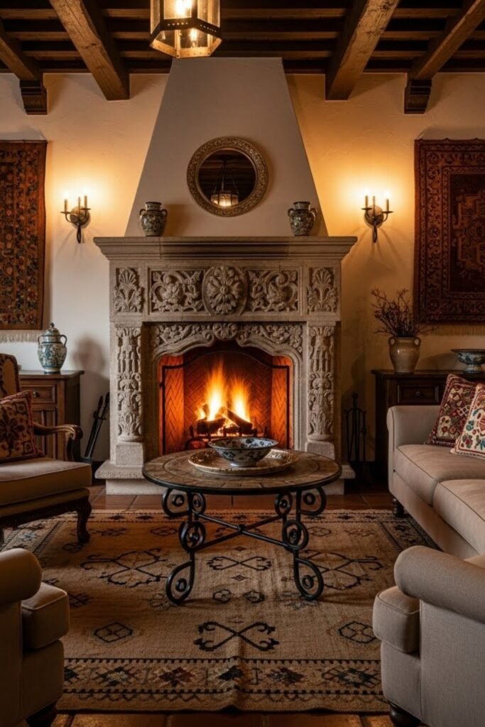 A stone fireplace becomes a strong focal point inside Spanish-style homes. Often detailed with carved stone or plaster surrounds, it adds warmth and texture to living spaces.
