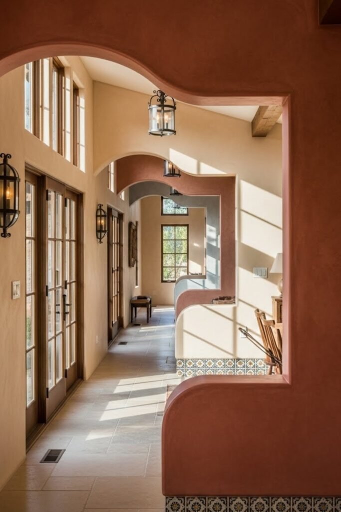 These colors create a calm, grounded feel and work well with stucco walls, tile floors, and wood details without overwhelming the space.