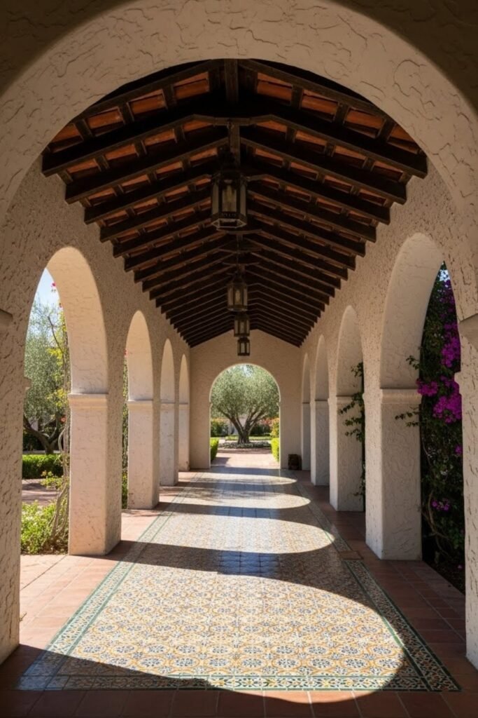Shaded walkways connect different parts of a Spanish-style home while protecting from direct sun. These covered paths often feature arches or wooden beams overhead.
