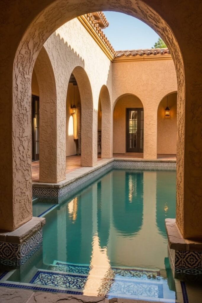 A courtyard pool offers privacy and comfort in Spanish-style homes. Instead of large open pools, these are often compact and tucked inside enclosed courtyards.