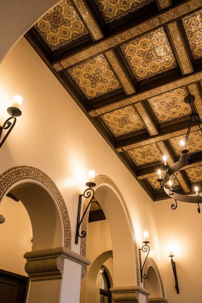Decorative ceiling tiles add unexpected detail to Spanish interiors. Painted or patterned designs draw the eye upward and add character without clutter.