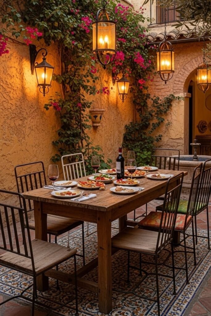 Outdoor dining areas are a natural part of Spanish-style homes. These spaces are often placed in courtyards or covered patios, making meals feel relaxed and social.