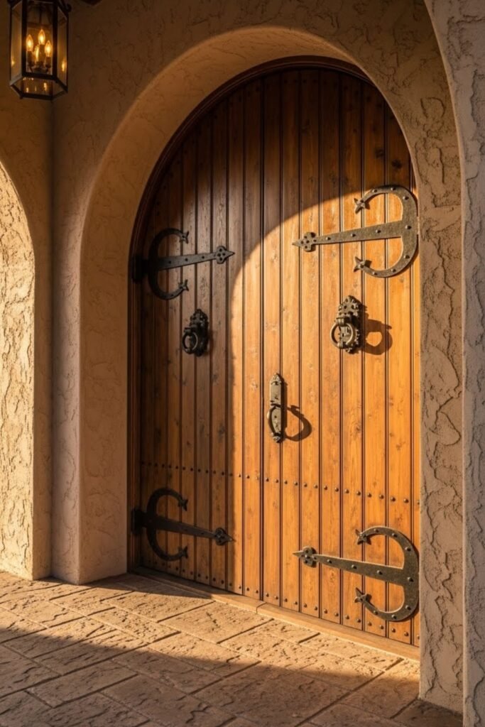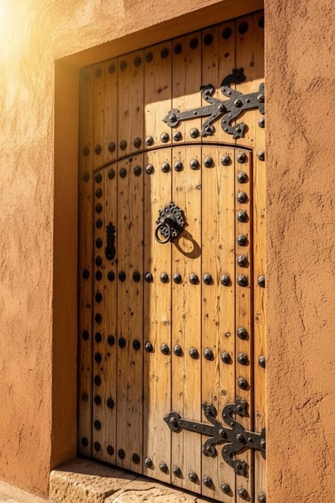 Rustic wooden doors make a strong first impression in Spanish-style homes. These doors are usually thick, solid, and paired with iron hardware.