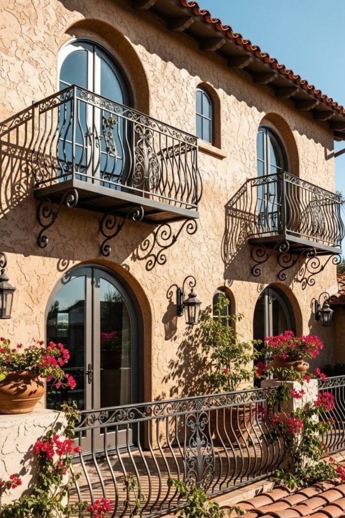 Wrought iron balconies add character and contrast to Spanish-style homes. These decorative features are often paired with arched windows or French doors.