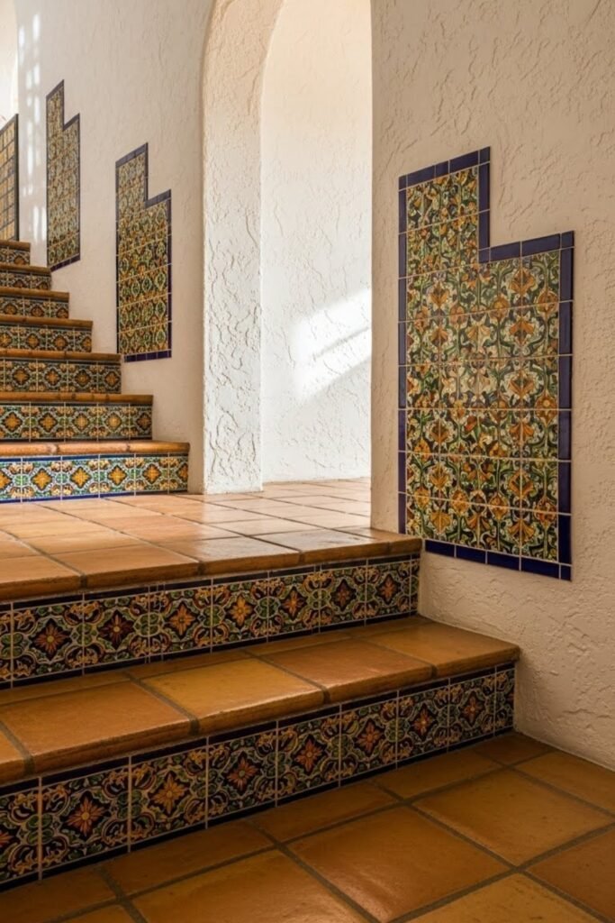 Colorful tile accents bring personality into Spanish homes. Hand-painted tiles are commonly used on stair risers, kitchen backsplashes, or patio walls.