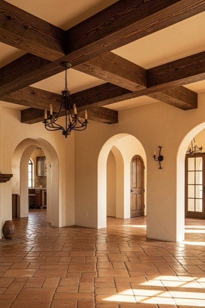 Exposed wooden beams add warmth and depth to Spanish-style interiors. They are often placed on ceilings in living rooms, kitchens, and hallways.