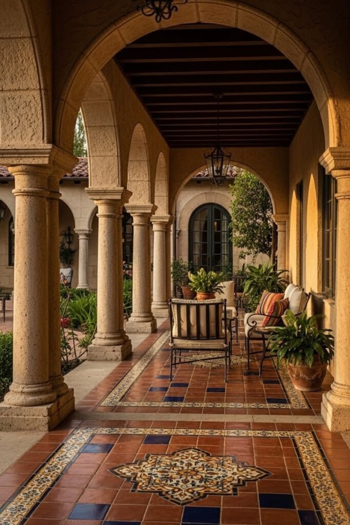 Thick columns and tiled floors enhance the Spanish aesthetic, making the portico both practical and visually striking.