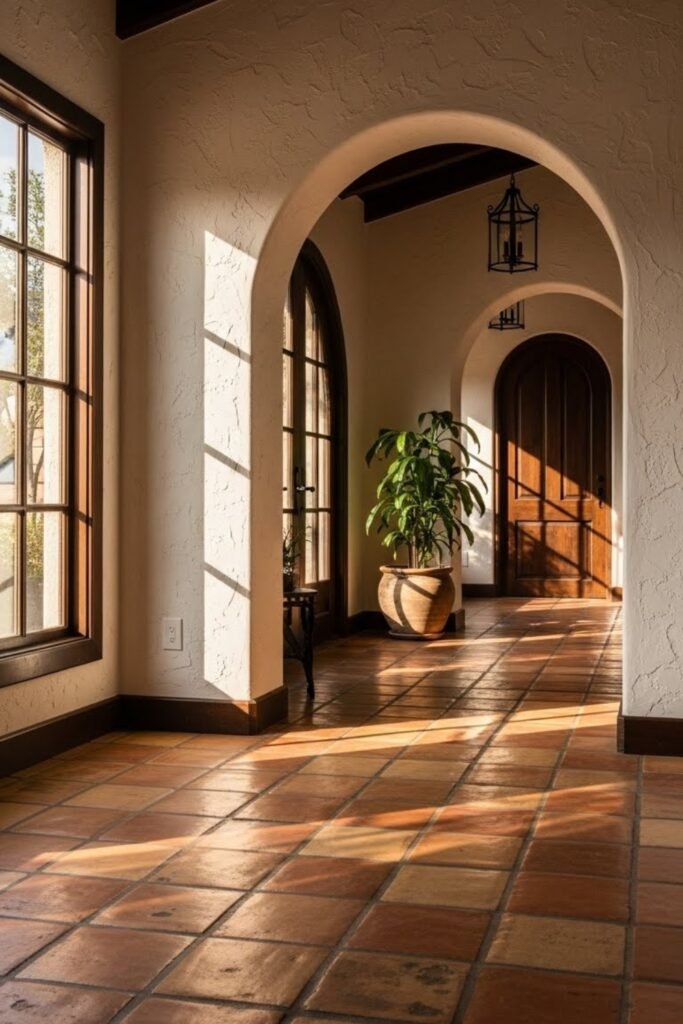Tile flooring is a practical and classic choice for Spanish homes. Terracotta or clay tiles stay cool underfoot and handle heat well.