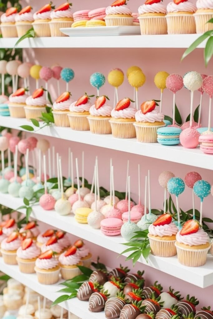 Turn sweets into décor by arranging strawberry desserts on a vertical display. Use shelves or pegboards to hold cupcakes, cake pops, and dipped strawberries.