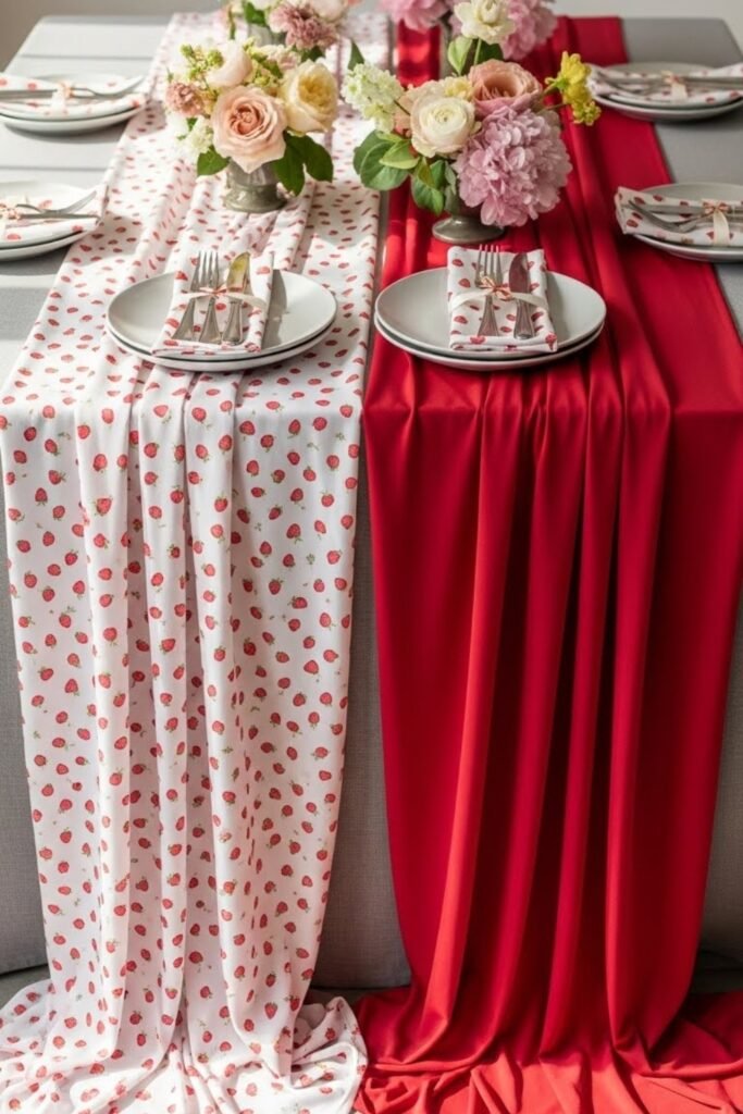 Lay strawberry-print or red fabric runners across neutral tables. Keep plates and décor simple so the runners stand out.