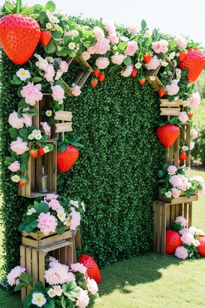 Create a photo area using greenery, strawberry cutouts, and soft florals. Add a simple sign to anchor the space. This gives guests a dedicated spot for pictures and keeps photos consistent.