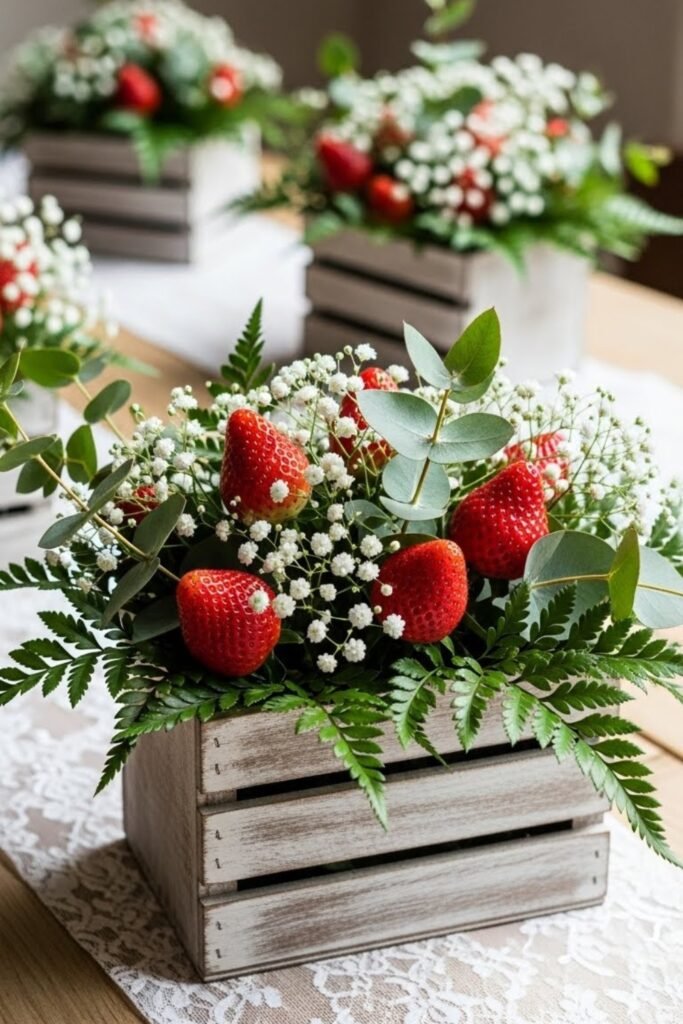 Use small wooden crates as table centerpieces filled with strawberries, greenery, and soft white flowers.