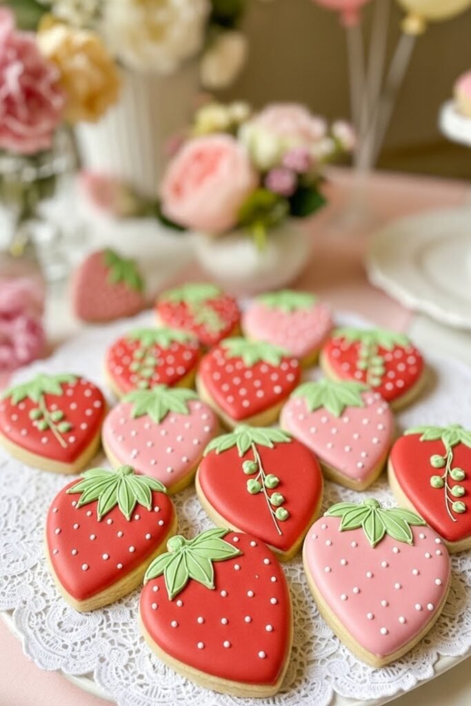 Serve strawberry-shaped sugar cookies decorated in soft red and pink icing. Keep the designs clean so they look polished on the dessert table.