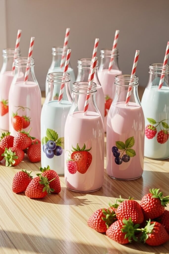 Set up a small drink station featuring strawberry milk served in jars or glass bottles. Pair it with plain or dairy-free options so everyone feels included.