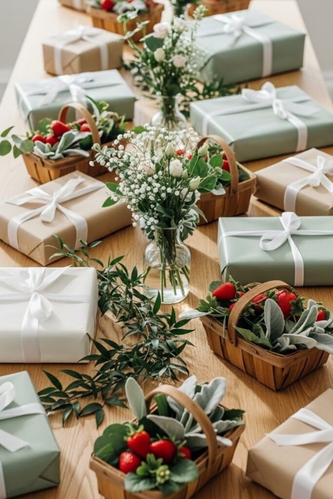 Style the gift table with berry baskets, light greenery, and simple strawberry signage.