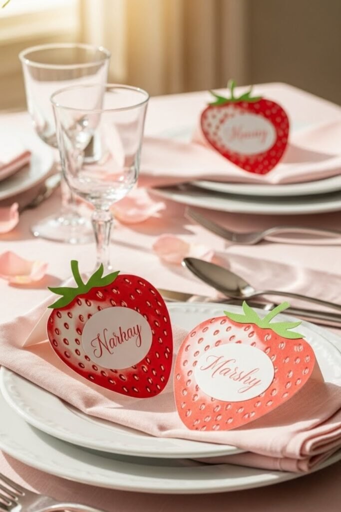 Use strawberry-shaped tags as place cards for each guest. Write names in soft lettering and place them on plates or napkins.