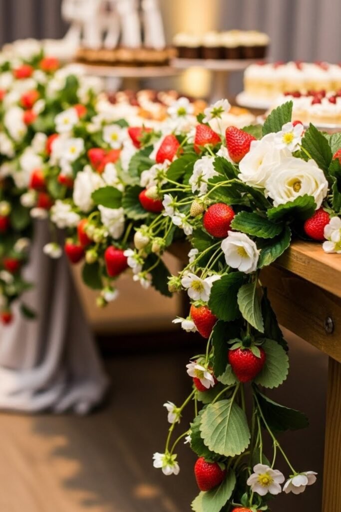 Drape a garland made of faux strawberries, greenery, and small white flowers across the dessert or photo area.