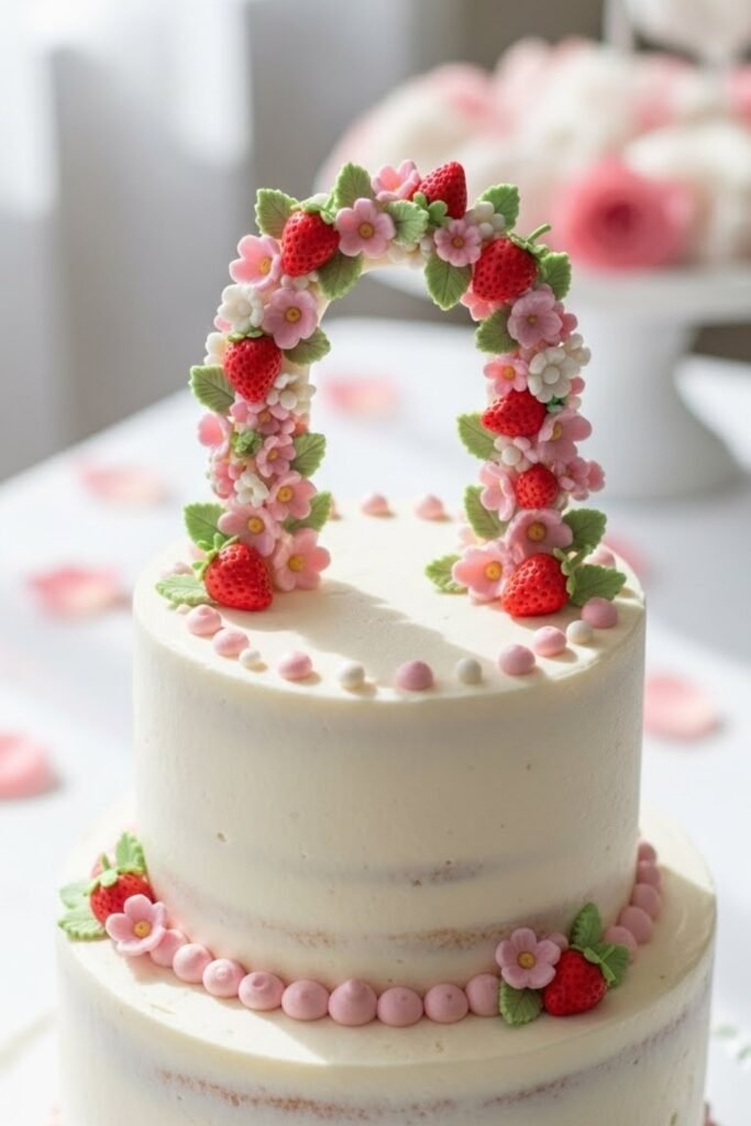 Finish the cake with a strawberry-themed topper featuring the baby’s name or a short phrase. Keep the cake itself simple so the topper stands out in photos.