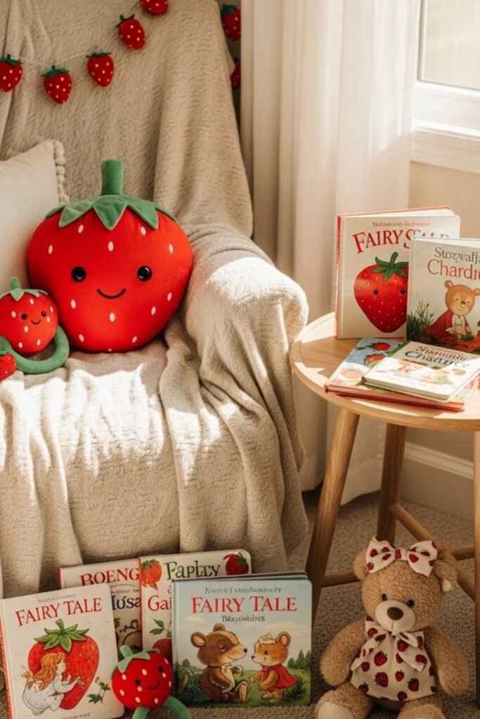 Create a cozy corner with strawberry-themed children’s books and soft plush toys. Add a small rug or blanket so the space feels warm and inviting.
